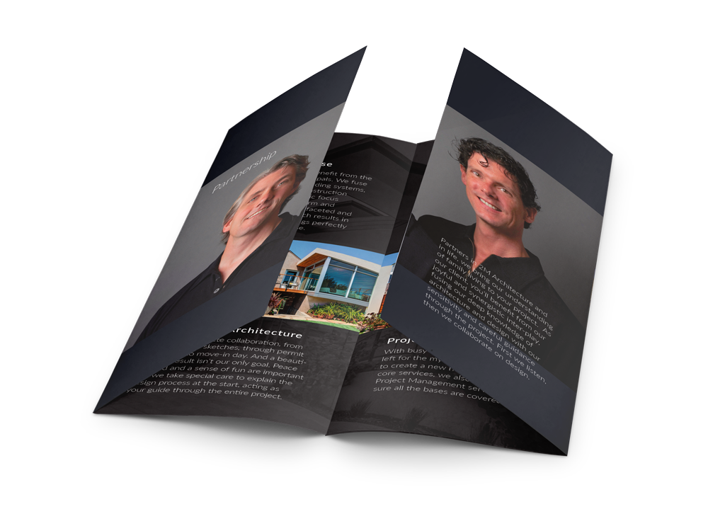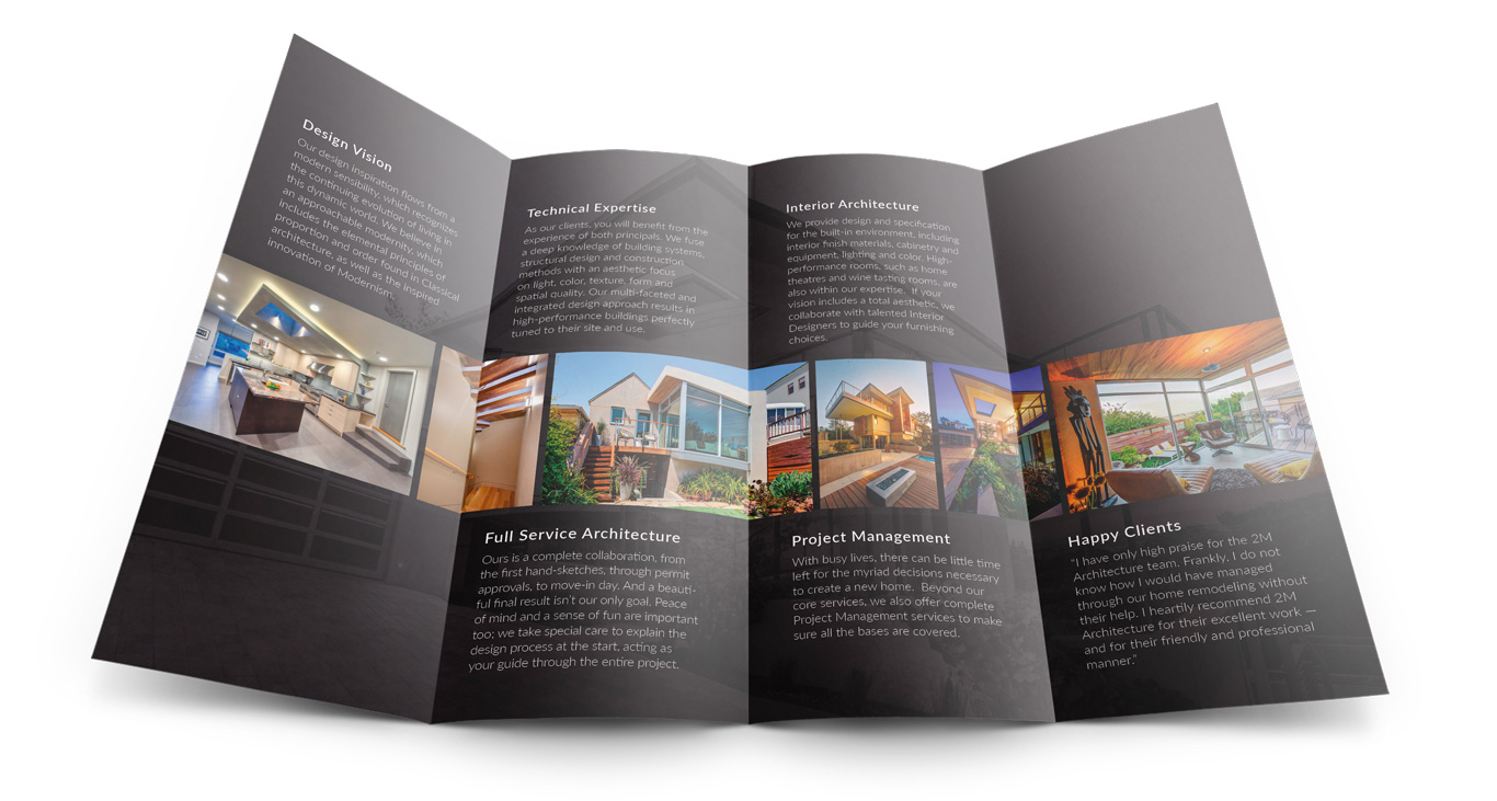 My primary focus is presentation design, but I take on the odd print project if I think it might be challenging and enjoyable. Recently a long-time client, 2M Architecture, called me about designing a brochure to compliment the website that I built for them. I told them it would be a pleasure.